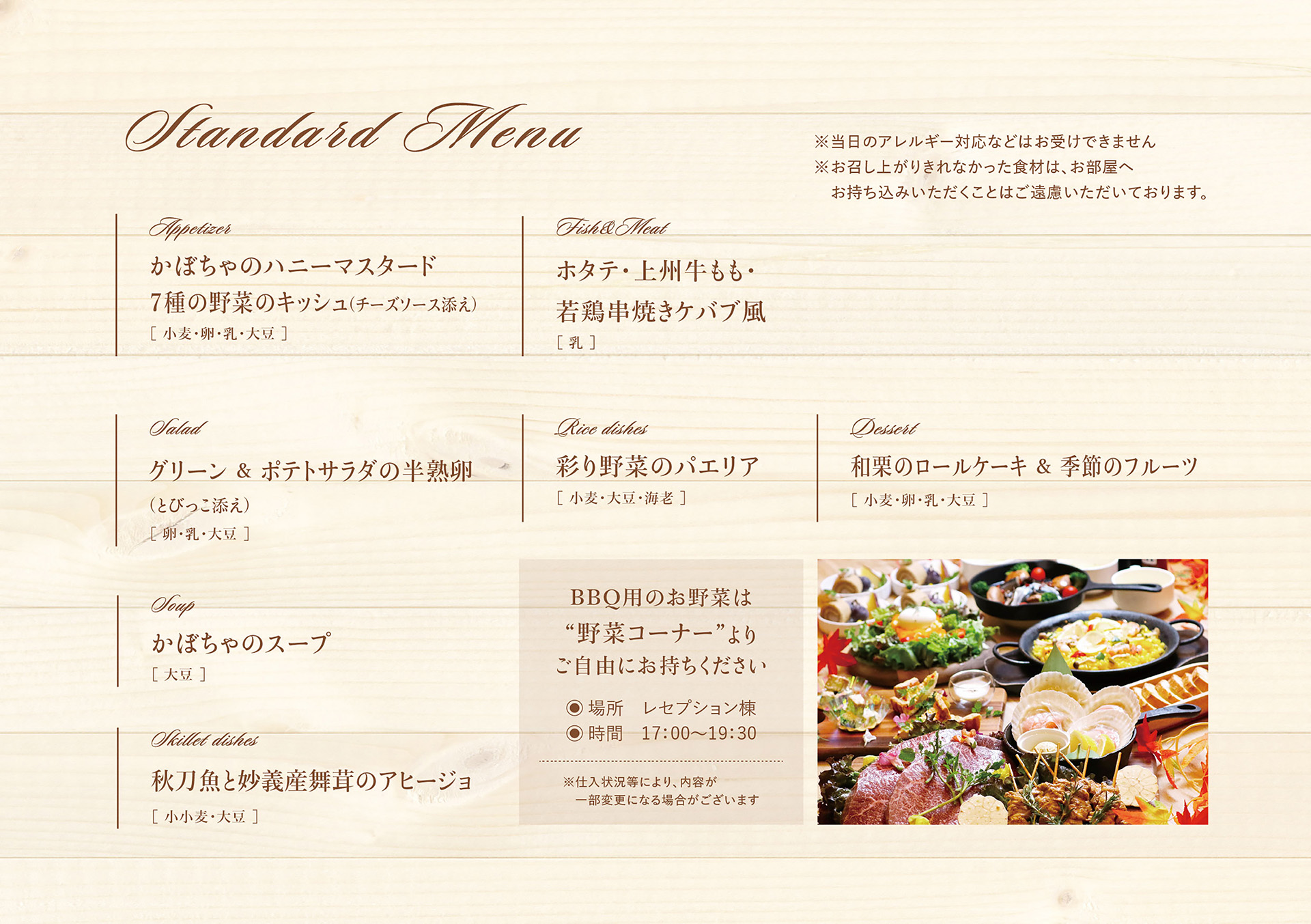 ※アレルギーをお持ちの方は事前にお知らせ下さい。当日のお申し出の場合にはご対応できかねます。